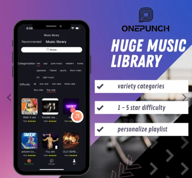 So in terms of music, you can choose a song from one of the 1,000 plus songs on our One Punch app which are all very motivational.