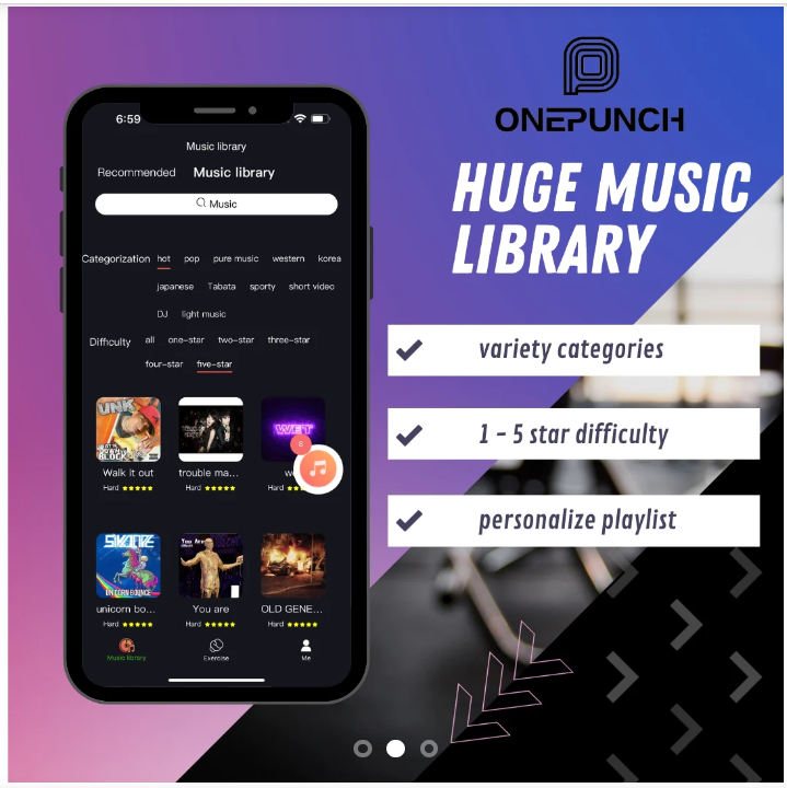 Diviértete con nuestra aplicación OnePunch dedicada con 900 canciones diferentes y funciones de concurso. Obtenga comentarios sobre sus habilidades de boxeo.